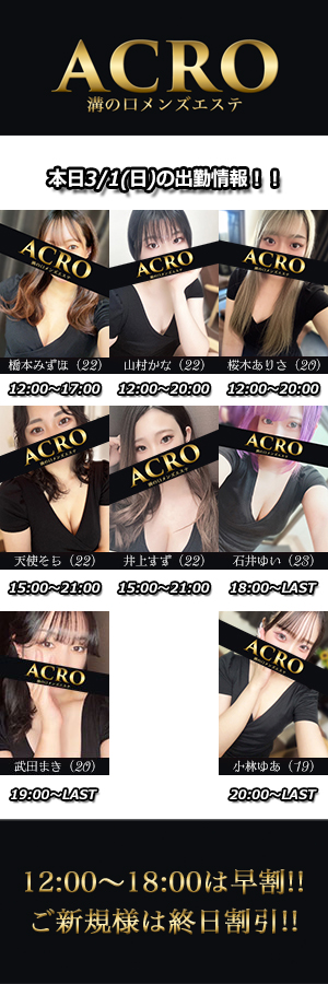 ----------------------★土曜日限定のお得なイベント情報★★ご新規様割★ALL TIME90分コース➡ 13,000円!120分コース➡ 17,000円!150分コース➡ 21,000円!※オプション込み込み価格♦入会金 サービス!!♦入会金無料・次回使用可能な割引券贈呈・指名料無料♦§ 会員様限定早割り §12:00~18:00までのご入店90分コース➡ 13,000円!120分コース➡ 17,000円!150分コース➡ 21,000円!※オプション込み込み価格♦ネット指名料無料♦--------------------ネット指名無料キャンペーン実施中!!≪ご新規様・会員様共通≫ALL TIME♦ネット指名料1.000円⇒ 無料!!『もっとお得に』・・・『気になるあの子で』・・・※初めて接客させていただくセラピストに限ります。-------------------------MizonokuchiACROーアクロー【営業時間】昼12:00~翌5:00(受付:3:00迄)【最寄り駅】東急田園都市線「溝の口」東口徒歩3分JR南武線「武蔵溝の口」北口徒歩3分【店舗住所】神奈川県川崎市高津区溝口1-18-12アーベイン溝ノ口ビル501号室