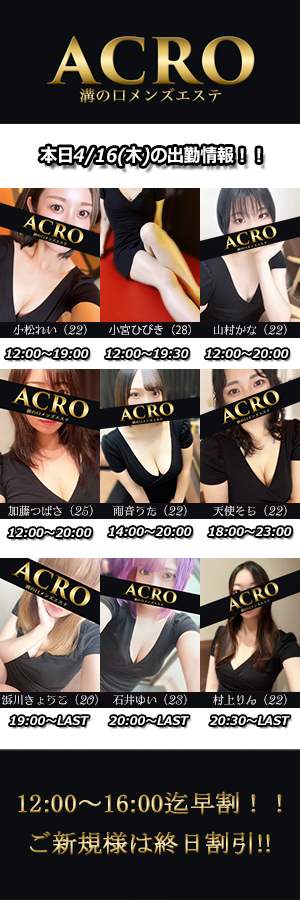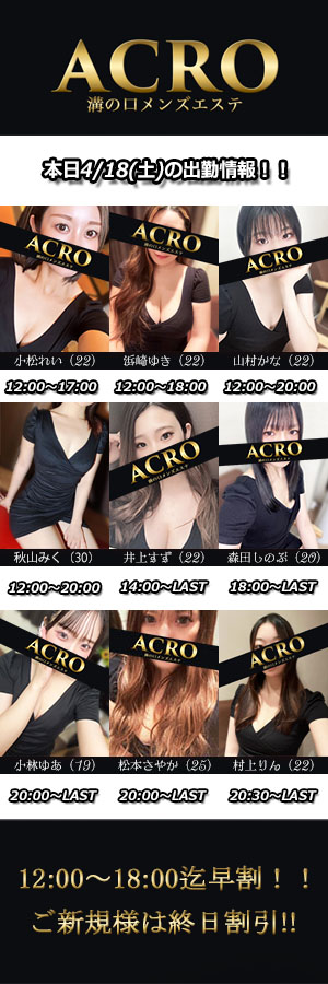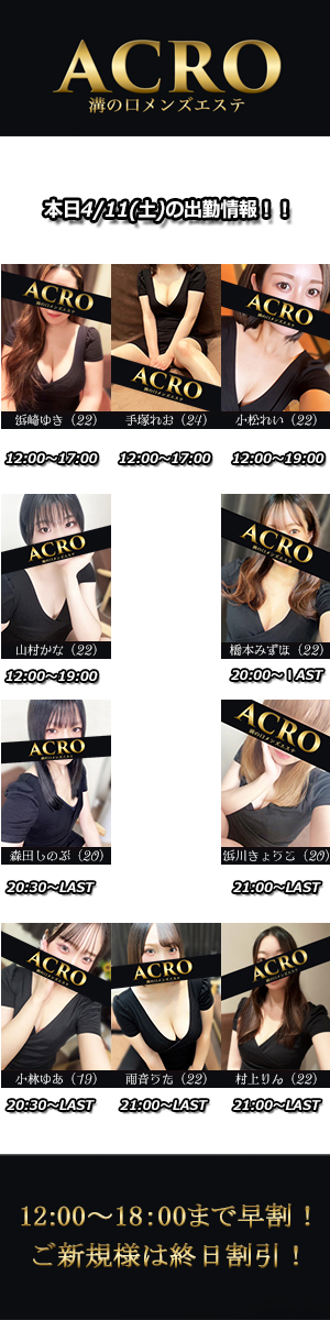 ※初めて接客させていただくセラピストに限ります。-------------------------MizonokuchiACROーアクロー【営業時間】昼12:00~翌5:00(受付:3:00迄)【最寄り駅】東急田園都市線「溝の口」東口徒歩3分JR南武線「武蔵溝の口」北口徒歩3分【店舗住所】神奈川県川崎市高津区溝口1-18-12アーベイン溝ノ口ビル501号室